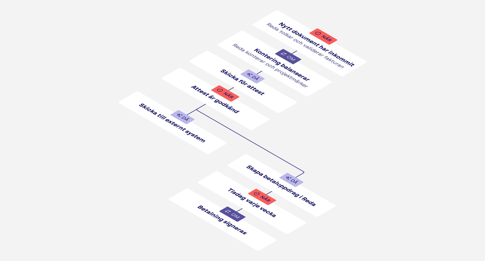 Reda tar emot en faktura (pdf, e-faktura, hämtar från annat system, fotat från mobilen, ja du fattar). Skickar en notis till din byråportal om du har en sådan. Konterar fakturan och skickar den för attest. Notifierar attestanter. När attesten är godkänd skickar vi information till projektsystem och ekonomisystem samt skapar ett betaluppdrag. Slutligen skickas fakturor för betalsignering och betalas på banken.